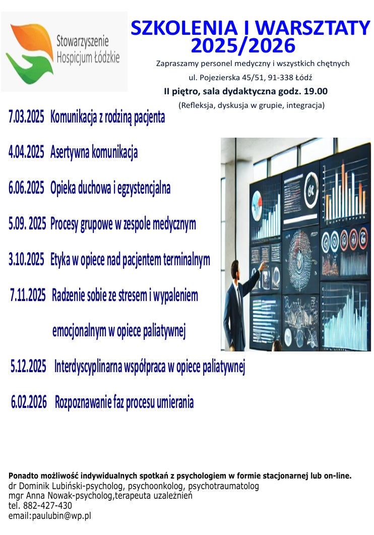 Przypominamy, że wraz z nadejściem jesieni kontynuujemy w naszym Hospicjum cykl warsztatów z psychologiem. Serdecznie zapraszamy wszystkich zainteresowanych do udziału – to wyjątkowa okazja do rozmowy, refleksji i wsparcia. - Jarmark Andrzejkowo-Świąteczny